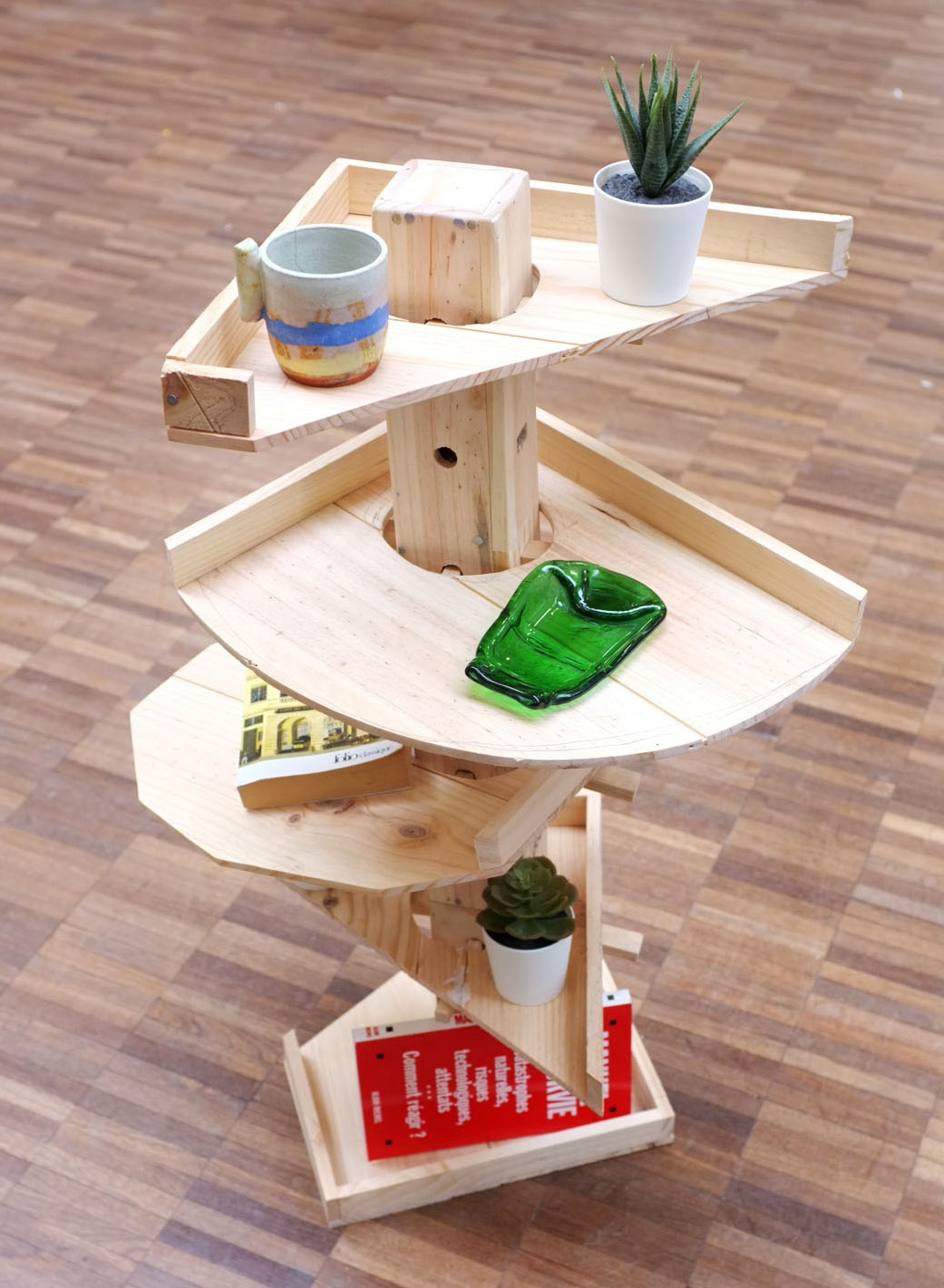 Grape, un « mobilier d’agencement destiné aux usages du balcon ou de la terrasse » qui, comme son nom l’indique reprend la forme d’une grappe de raisin grâce à « un axe central, percé de trous, [qui] permet à des tiges de bois de s’insérer aux niveaux souhaités pour soutenir les différentes tablettes ».