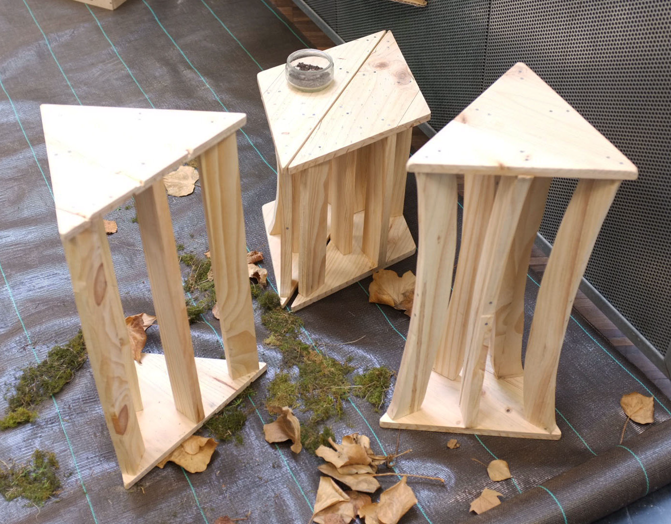 2 Boxes to sit : ou deux boîtes pour s’assoir, recycle deux boîtes en une chaise. « Les deux caisses initiales sont démontées, contrecollées pour renforcer les surfaces, découpées à la scie et assemblées par des pointes » pour aboutir à un siège avec deux assises (à 50 et 35 cm de haut), ou à une table basse (à deux niveaux). Le tout « sans aucune chute issue de la transformation ».
