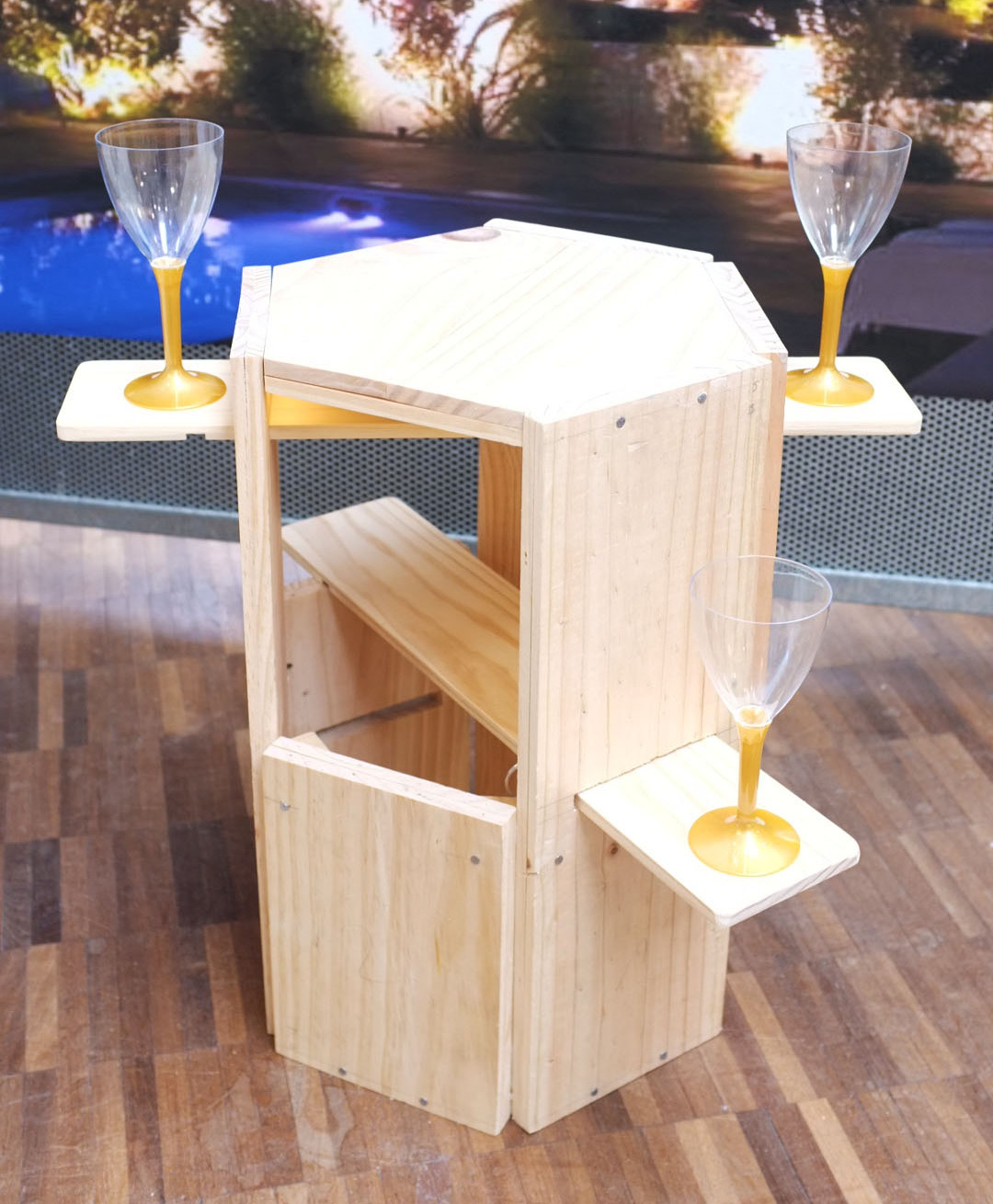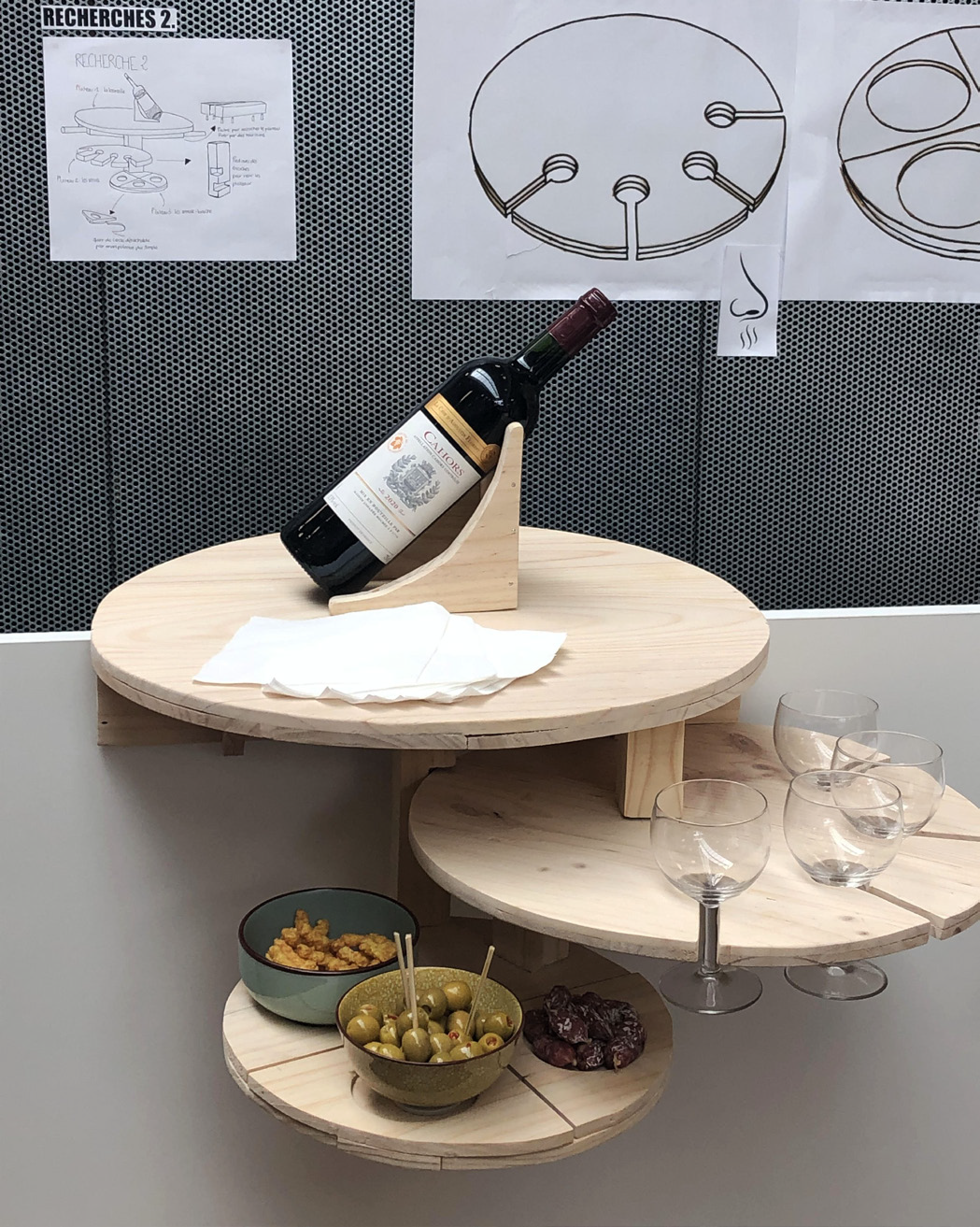 Pompette au balcon transforme une caisse en trois plateaux pour organiser l’apéritif sur un balcon : « le premier plateau évoque le sens de la vue et met en valeur la bouteille. Le second plateau symbolise le nez. On y trouve les verres suspendus grâce à des encoches dans le plateau. Le troisième plateau évoque la bouche, étape où l’on confirme les sensations du vin, accompagnée d’amuses bouches. »