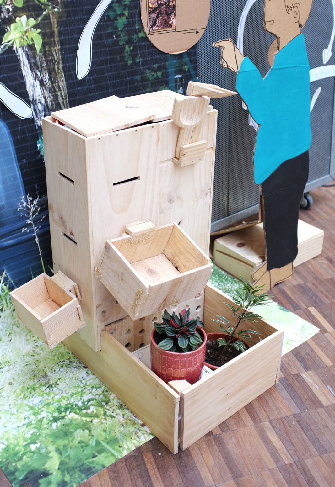 Compos’t moi propose aux enfants de bricoler, sous la supervision d’un adulte, pour se doter d’un composteur : recycler une caisse de bois pour recycler les déchets organiques du foyer. « Le dispositif se présente sous la forme d’une imbrication de volumes de dimensions et formes variées, assemblés par des systèmes d’encoches », sachant que « des outils d’aération et de récupération du compost sont réalisables ».