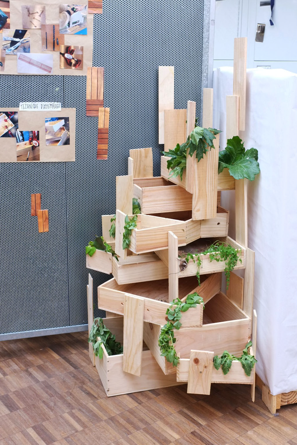 Boiromatique permet de « faire pousser des herbes aromatiques sur son balcon ou sa terrasse, sous la forme d’une structure verticale de bacs empilés ». Revendiquant sa filiation avec le Vortex bois de l’espace Darwin à Bordeaux (conçu par l’architecte Laurent Tardieu), cette proposition est aussi pratique : « les bacs communiquent entre eux via des perforations, permettant à l’eau de s’écouler progressivement vers le bas. L’arrosage se fait donc en toute simplicité en haut du dispositif ».