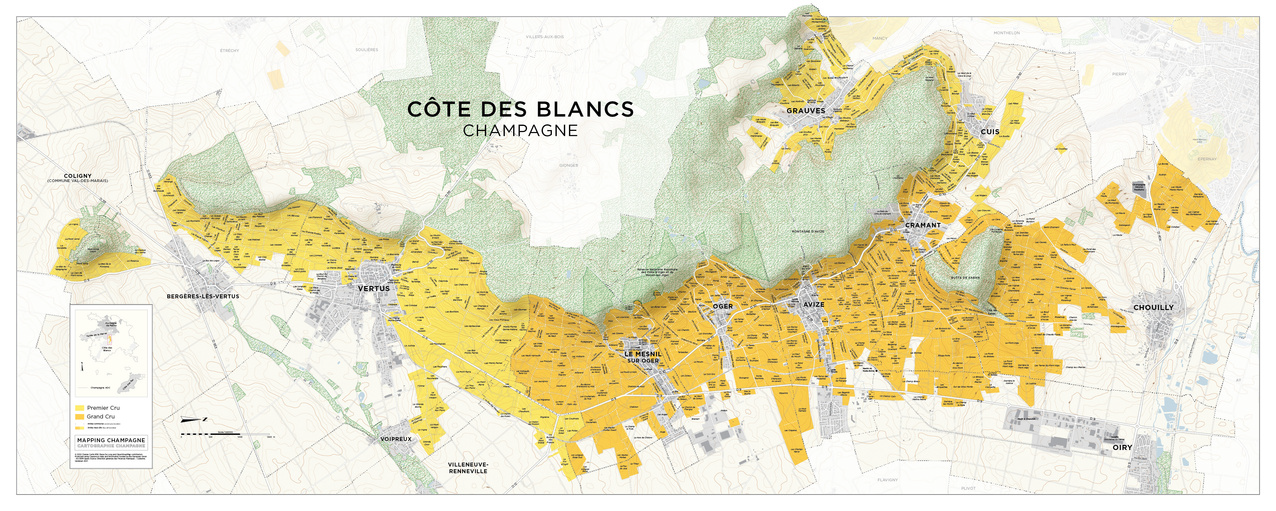 vec ses 280 000 parcelles ayant une surface moyenne de 12 ares, le vignoble champenois ne disposait pas encore de cartographies détaillées. Ce vide est en passe d’être comblé avec le lancement de Mapping Champagne, une série de cartes élaborées par Charles Curtis et Steve de Long. Tous deux américains, Charles Curtis, expert international du champagne et Steve de Long, architecte passionné de vins, se sont inspirés des cartes créées par Louis Lamat il y a 80 ans. Ces deux auteurs proposent une grande carte des régions viticoles de la Champagne, ainsi qu’une carte de la Côte des Blancs et une carte pour chacun de six villages de la Côte des Blancs : Chouilly, Cramant, Avize, Oger, Le Mesnil sur Oger et Vertus.