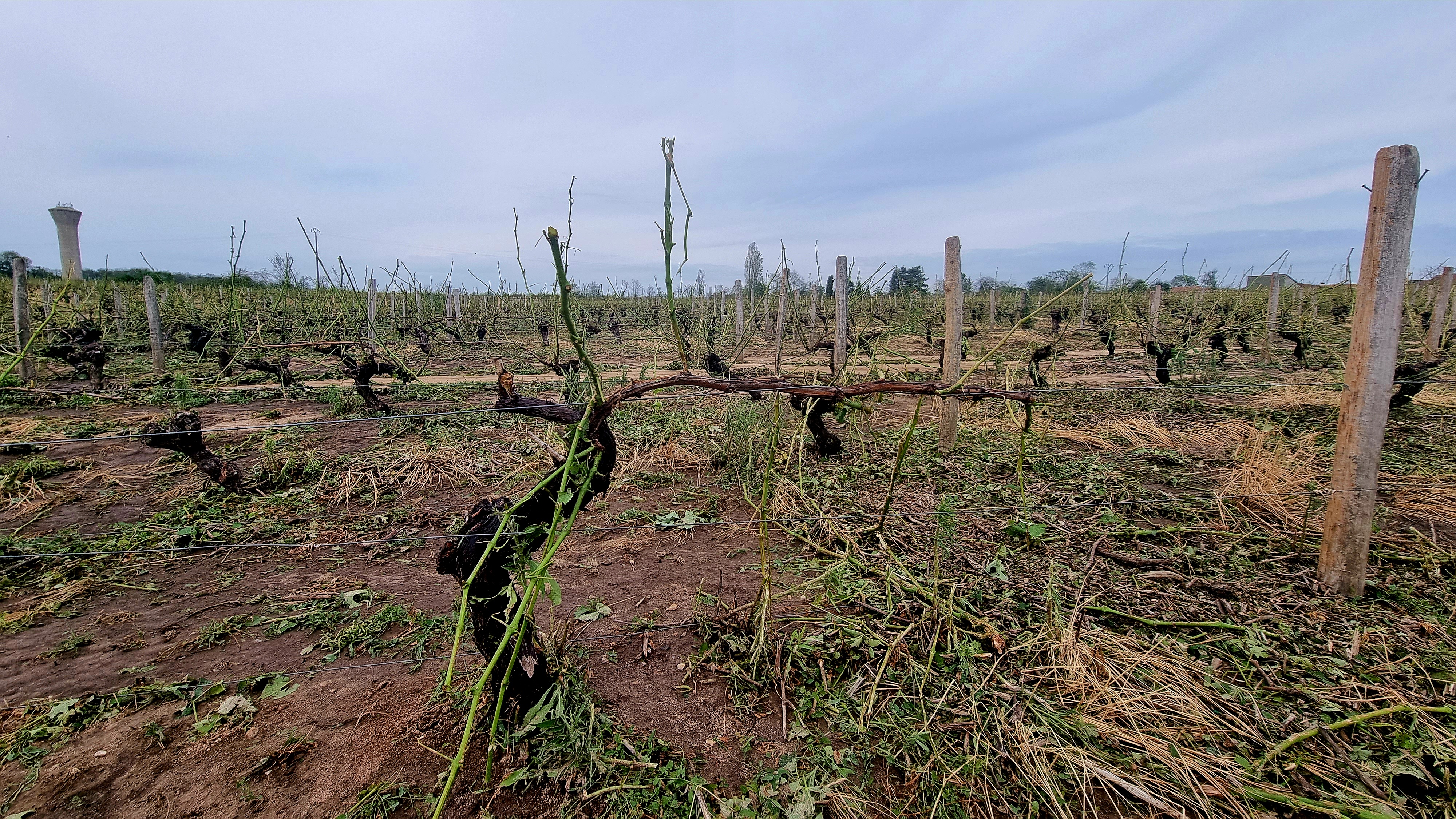 "Comme un ouragan"... La furie des éléments a emporté les feuilles et grappes, laissant des rameaux déplumés et désarticulés sur les ceps. Photo : © Préfecture du Cher - Sébastien JACQUES - juin 2023.