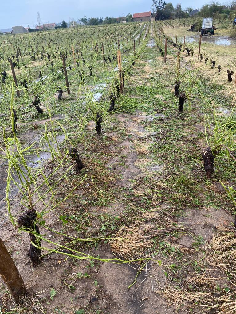 ne vigne en hiver… En plein été. C’est le spectacle désolant offert actuellement par les vignobles Beurdin et Fils sur la commune de Preuilly (Cher), dévastés par un orage de grêle et une tornade ce lundi 19 juin. « De toute façon, il faut passer au-dessus » pose Jean-Louis Beurdin. Exemple de résilience vigneronne, il vient de nettoyer sa cave (avec 10 à 30 cm d’eau après la tempête) et attend que la vigne repousse, alors que toutes les grappes et feuilles sont tombées sur ses 20 hectares de vignes en AOC Reuilly touchées à 100 % (il n’y aura pas de raisins, mais des rameaux pour tailler et préparer l’an prochain).