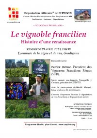 "VOYAGE AUX PAYS DU VIN" Le vignoble francilien, histoire d'une renaissance Rencontre avec : Patrice Bersac, président des Vignerons Franciliens Réunis. Premier vignoble de France jusqu'au 18e siècle, quasiment disparu au 19e siècle, le vignoble francilien renaît avec une IGP (Indication Géographique Protégée). Soirée animée par Amancio Tenaguillo y Cortázar, président de CEPDIVIN. Avec la participation deGérald Mazaud, liseur spiritueux de circonstances. Causerie, diaporama, lectures & dégustation de vins franciliens.