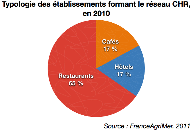 Les achats de vins représentent en moyenne 17 % du total des achats d’un établissement de CHR. Les vins occupent ainsi le second poste d’achat de ces commerces, venant derrière les achats de produits frais (25 % des dépenses), mais restant devant ceux de produits surgelés (12 %). Dans le détail, les achats de vins tranquilles représentent quasiment le double de la valeur dépensée en vins pétillants (11 % contre 6 %). A l’échelle nationale, les appellations les plus représentées sur les cartes des vins sont la Champagne, le Bordeaux, la Provence et la Vallée du Rhône.