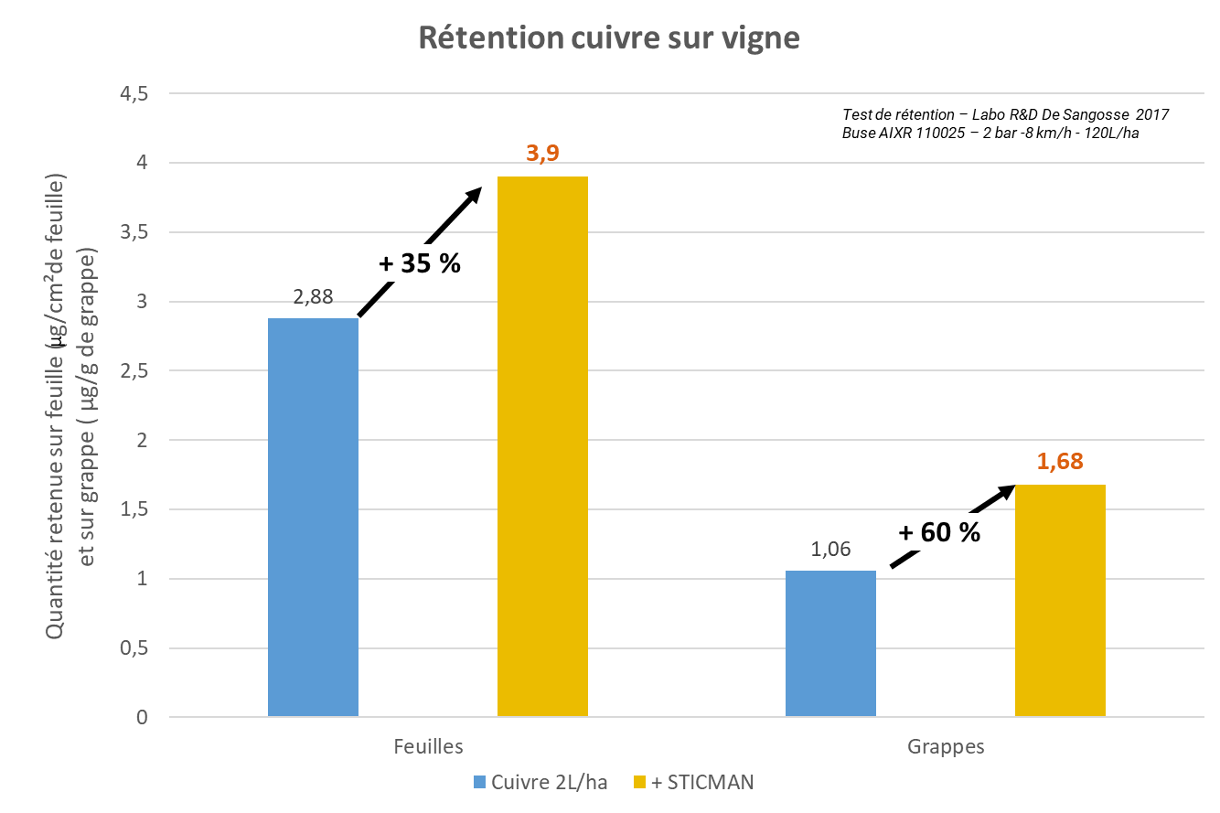 Les qualités anti-rebond et rétenteur du STICMAN® augmentent la quantité retenue de + 35 % sur les feuilles et de + 60% sur les grappes.