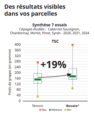 En effet, les essais menés sur des vignobles tels que le Languedoc, la Champagne et le Bordelais révèlent que l’application de Bovato® augmente le poids des grappes de 17 à 34 % selon les conditions climatiques et les cépages.