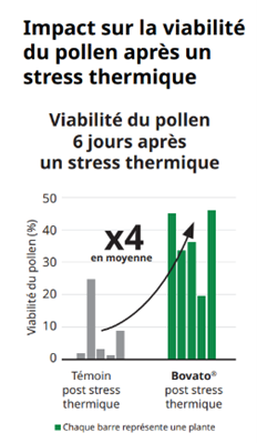 Ces stress climatiques peuvent affecter la viabilité du pollen et donc compromettre la floraison et la pollinisation. Bovato® se révèle particulièrement efficace dans ce contexte en améliorant la tolérance des plantes face aux températures élevées et aux périodes de sécheresse. Il favorise la viabilité du pollen, assurant ainsi une floraison optimale et une meilleure pollinisation malgré des conditions défavorables.