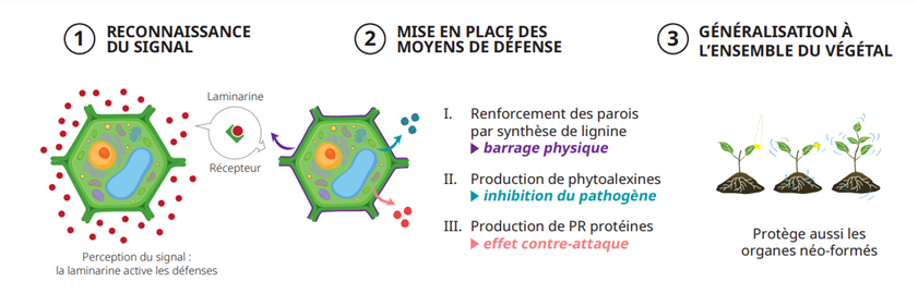 VINIVAX® est un stimulateur de défense utilisable dans le cadre de la lutte contre l’oïdium de la vigne. Il est composé de laminarine, un principe actif 100% naturel extrait d’une algue brune (Laminaria digitata), de la famille des oligosaccharides, qui a la capacité d’agir comme un éliciteur activant les défenses naturelles. En effet, la structure de la laminarine est semblable à certains produits de dégradation des parois des champignons pathogènes, les oligoglucanes, éliciteurs des réactions de défense chez les plantes. Une fois appliquée sur un végétal, la laminarine leurre ainsi la plante en étant reconnue comme signal d’attaque et entraîne la mise en place de ses défenses naturelles.