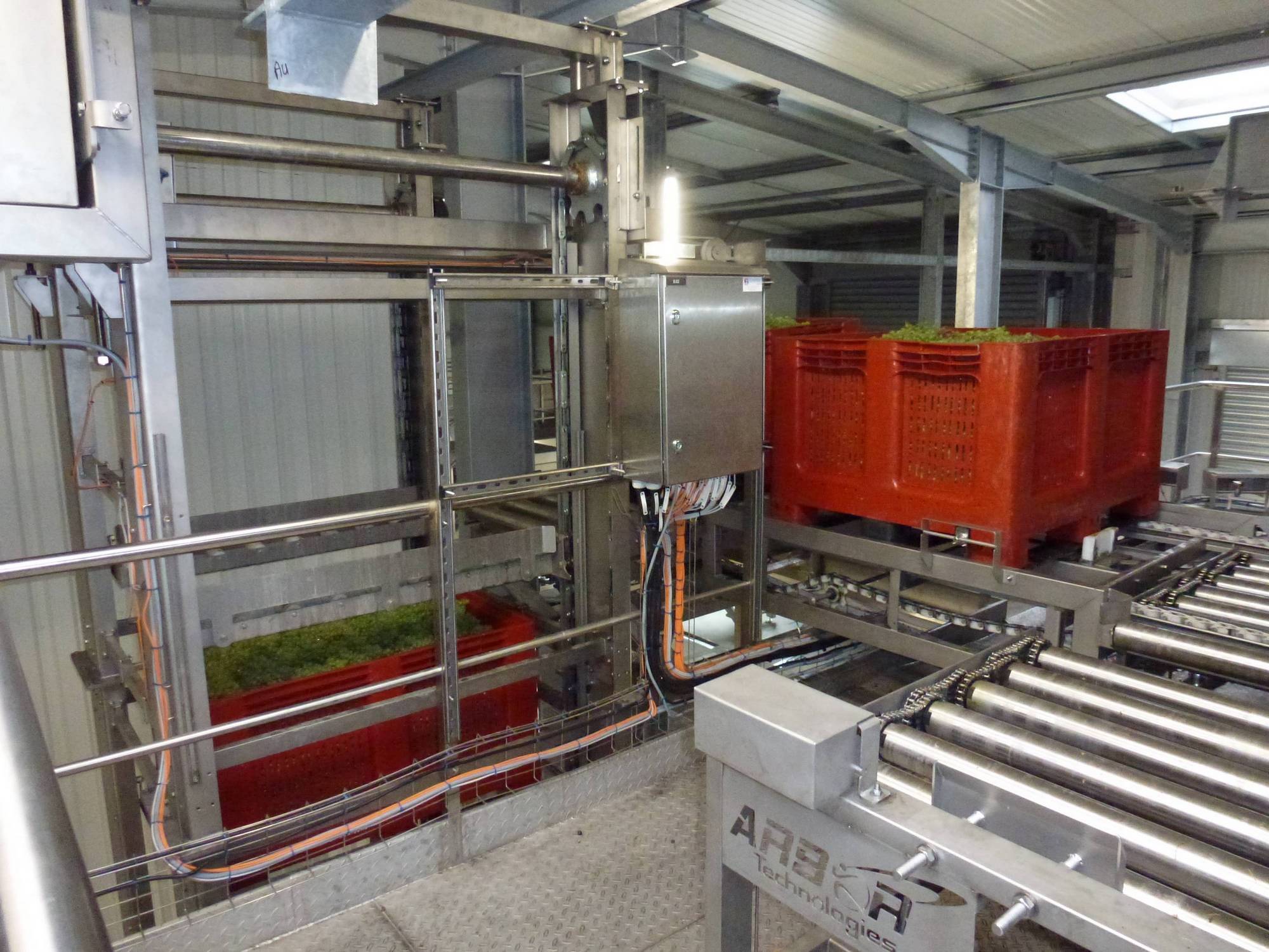 Dès leur arrivée, les caisses d’une capacité de 350 kg (1er levier) sont gérées par paire (2ème levier). Arrivées superposées, un dépileur les sépare. Une fois les semelles lavées, les voilà à nouveau à 2 dans l’ascenseur double étage (3ème levier) pour « remonter » la gravité. Cheminant sur le convoyeur au dessus des pressoirs, l’automatisme du système oriente intelligemment les caisses vers des retourneurs alimentant par gravité les pressoirs doubles portes en alternance (4ème levier).