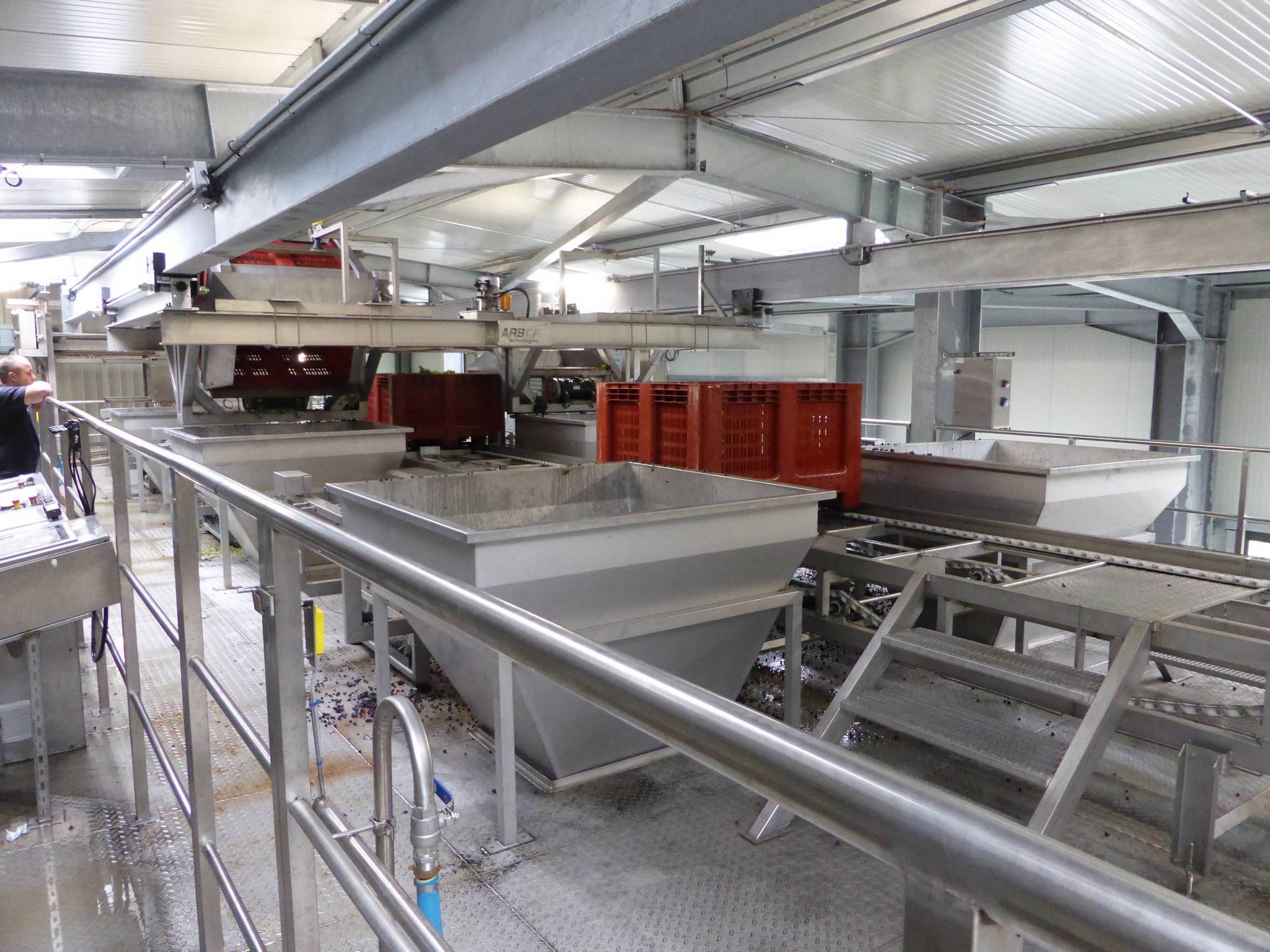 L’automatisme avancé de cette ligne d’alimentation de pressoirs a permis de traiter in fine jusqu’à 1000 palox/j à la cadence de 120 palox/h (à raison de 350 kg/palox)