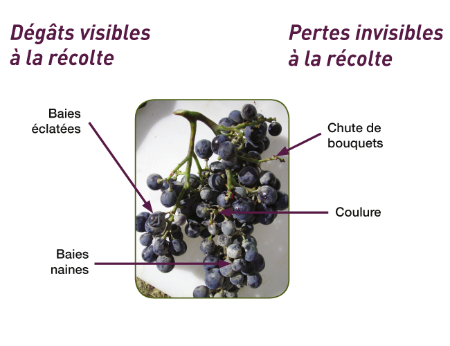 L'oïdium peut se manifester de différentes façons sur la vigne. Il peut apparaître sous la forme de baies nanifiées ou de baies éclatées couvertes de moisissure grisâtre, bien visibles à la vendange. Il peut aussi provoquer des dégâts qui ne sont pas visibles à la récolte. Les attaques au moment de la floraison, ou juste après, peuvent entraîner de fortes coulures des fleurs et même la disparition de bouquets floraux complets. Ces dégâts sont invisibles le jour de la vendange, mais la perte de rendement peut être conséquente.