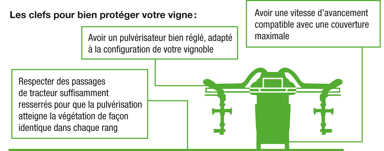 Pour mesurer l’homogénéité du traitement sur la vigne, BASF a mis au point un service de diagnostic, Evidence à la Vigne. Grâce à des capteurs installés dans la végétation, cet outil permet de visualiser la répartition du traitement sur les feuilles et les grappes, et éventuellement de corriger le réglage du pulvérisateur. En 2016, une étude conduite dans 82 parcelles à l’aide de ce diagnostic, a montré que les grappes n’avaient pas été suffisamment protégées dans 31 % des parcelles, et les feuilles, dans 36 % d’entre elles ! Pour bien protéger la vigne, le pulvérisateur doit être bien réglé et adapté à la configuration du vignoble.