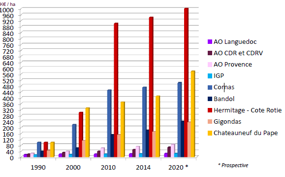 Les AOC génériques Languedoc et Côtes du Rhône sont stables respectivement 17 000 €/ha pour le Languedoc et jusqu'à 25 000 €/ha pour les Côtes du Rhône.