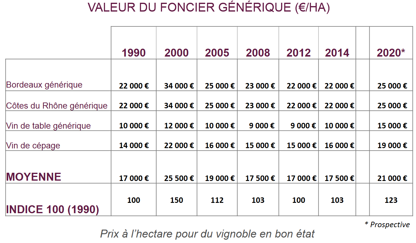 Deux marchés cohabitent, celui des crus qui évolue à la hausse de façon permanente et récurrente (les valeurs ont été multipliées par 9 depuis 1990) et le marché des vignobles en générique dont les valeurs n'ont quasiment pas évolué.