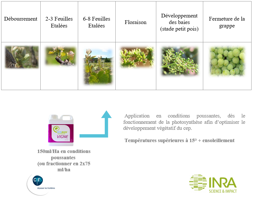 2. En début de campagne, dès le départ de végétation, en condition de forte pousse, ECOBIOS® VIGNE va permettre, avec une photosynthèse accrue, le bon fonctionnement du feuillage ainsi qu’une incidence positive sur la vigueur et le départ du cep de façon générale.