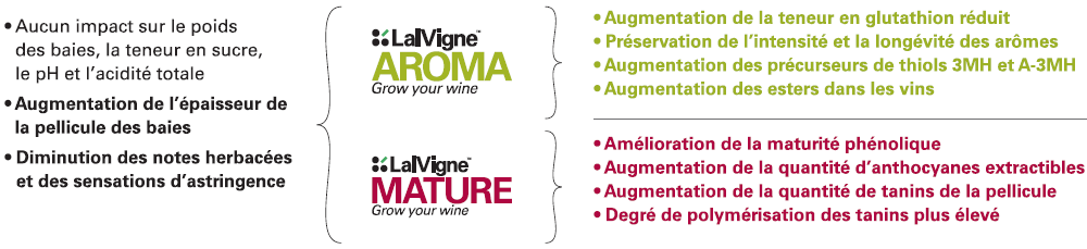 Les produits de la gamme LALVIGNE® sont composés de fractions spécifiques de dérivées de levures Saccharomyces cerevisiae, non OGM et font l’objet d’un brevet en instance de dépôt (EP 2882838). Autorisés en Agriculture Biologique, LALVIGNE® AROMA et LALVIGNE® MATURE s’appliquent par pulvérisation foliaire, en deux applications encadrant la véraison. Chacun a un objectif bien spécifique : LALVIGNE® AROMA permet d’améliorer le potentiel aromatique des vins blancs et rosés et LALVIGNE® MATURE améliore la maturité phénolique des vins rouges.
