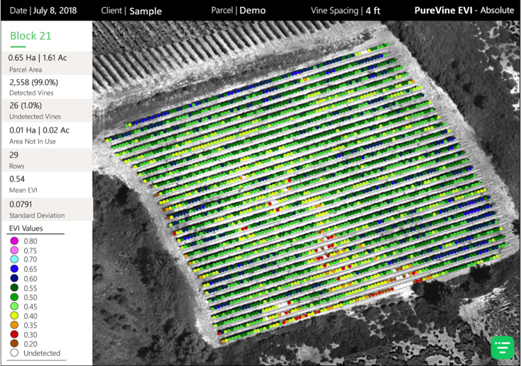 Figure 1: PureVine EVI map with row, zone, and block stats