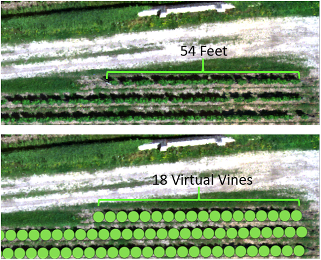 Figure 2: illustration of our proprietary plant counting method. Virtual Vines are added to each row based on the provided vine spacing. In this example, the provided vine spacing was 3 feet, resulting in 18 virtual vines for that row.
