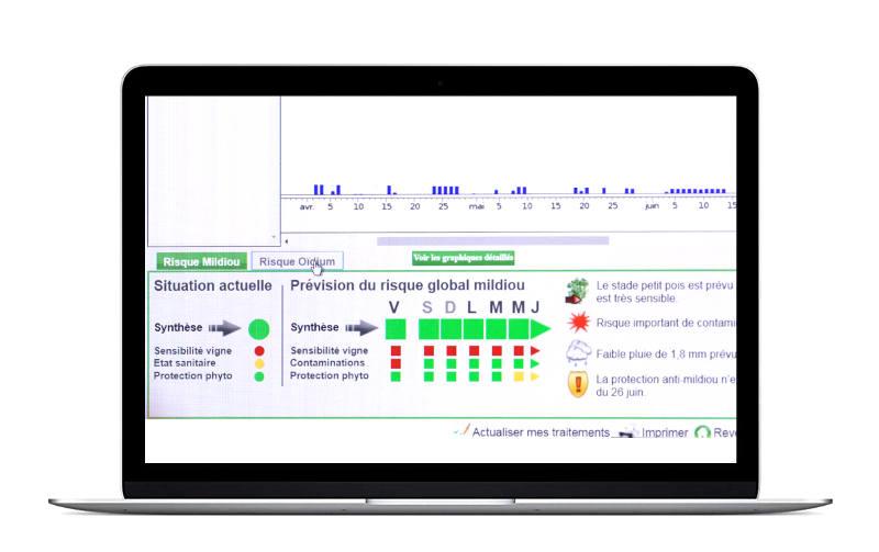 Les viticulteurs qui utilisent Movida® sont alertés dès que le risque mildiou ou oïdium est avéré. Un tableau de bord leur livre quotidiennement la situation de la pression maladie avec des indicateurs sur le niveau de contamination, de protection de la vigne, les pluies annoncées, le stade de la vigne.