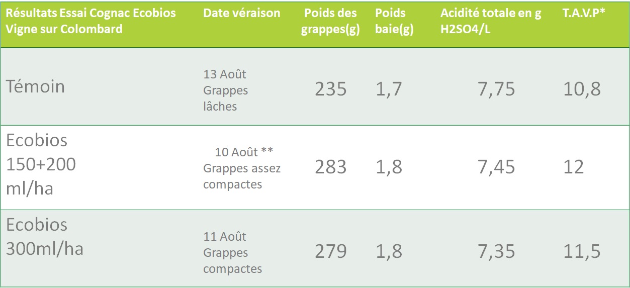 Résultats d’essai avec ECOBIOS® VIGNE sur raisins Colombard à Cognac