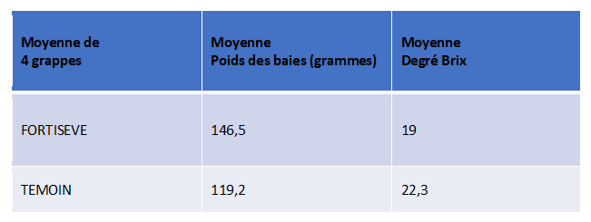 On constate que l’emploi de FORTISEVE®a permis d’augmenter de +25% le poids des baies par rapport aux témoins et de limiter la valeur élevée du taux de sucre de 15%.