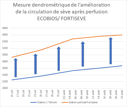 La comparaison des mesures dendrométriques sur les ceps atteints d’ESCA montre +30% de circulation de sève supplémentaire après perfusion avec FORTISEVE®par rapport au témoin (COMSAG - TCSD 44).