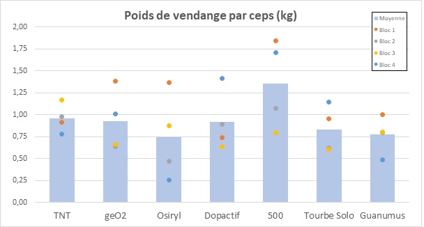Comme le montre la figure 1, les activateurs de fertilité du sol n’ont pas permis d’augmenter le poids de vendange. Au contraire, en dehors de la préparation biodynamique n°500, les poids de vendanges sont en moyenne inférieurs au TNT. Cependant aucune différence statistique n’est mise en évidence. On remarque tout de même que le poids de vendanges est plus homogène sur la modalité TNT que sur les autres modalités. On remarque également que la préparation biodynamique n°500 a permis de nettement augmenter le poids de vendanges sur deux répétitions.
