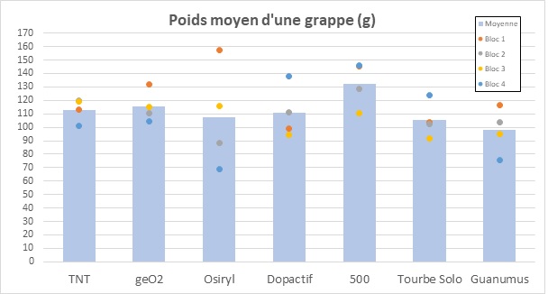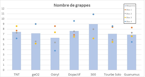 Comme dans le cas précédent, aucune différence significative n’est mise en évidence entre les modalités. Le nombre de grappes par pieds est inférieur au TNT pour le geO2®, l’Osiryl®, la Tourbe Solo® et le Guanumus®. Le nombre de grappes est en revanche plus important sur les blocs traité au Dopactif® et à la préparation biodynamique n°500. Pour cet indicateur, la préparation biodynamique n°500 semble donc encore avoir le plus d’effet même si cela n’est pas significatif.