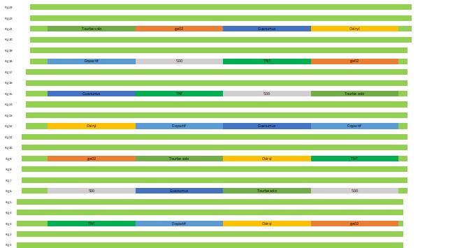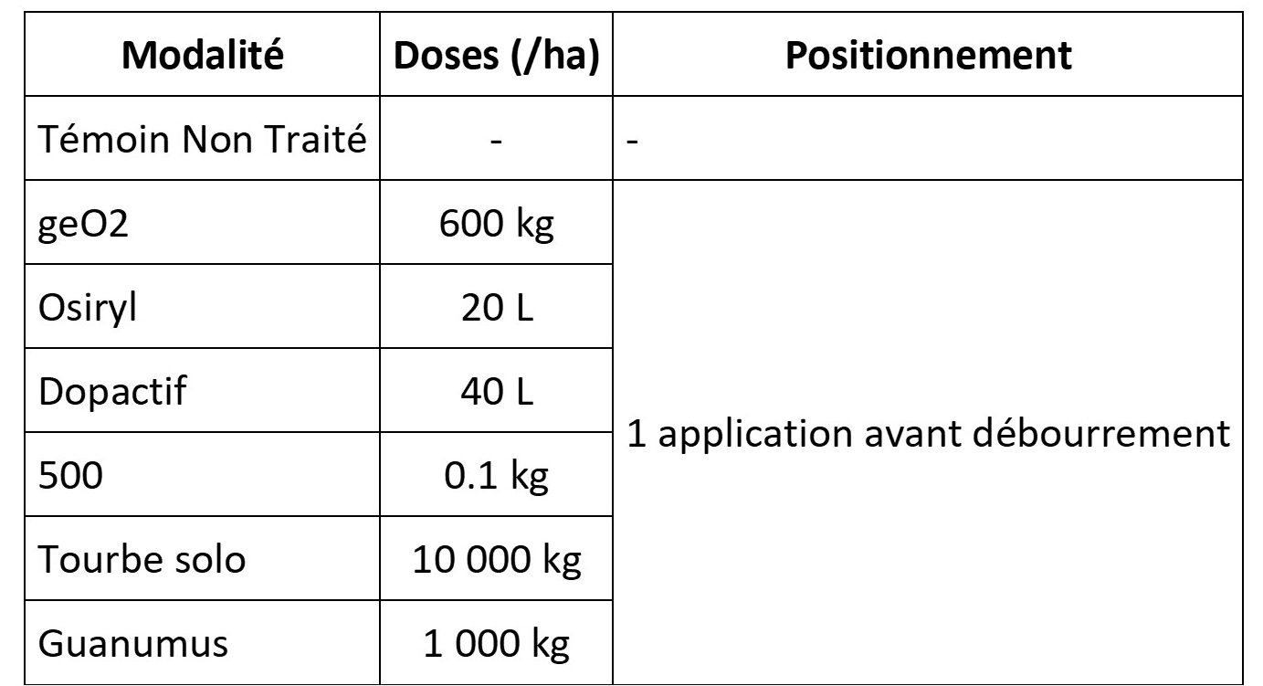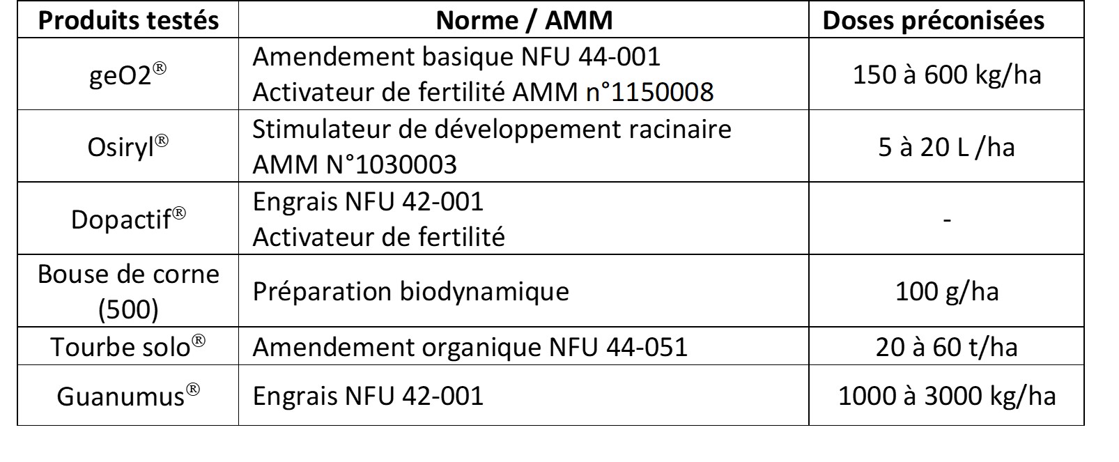 Parmi l’offre de produits du marché, six produits ont été testés dont quatre activateurs de fertilité. Le geO2® est un amendement basique associé à du MIP Soil (stimulateur de l’activité des micro-organisme) et des biopolymères. Cette association a pour but d’améliorer l’activité biologique des sols. Osyril® est un stimulateur de développement racinaire à base d’Osyr qui permet de protéger les auxines (hormones de croissance racinaire) de la dégradation. Il permet ainsi de stimuler le développement racinaire et ainsi l’assimilation des éléments nutritifs. Dopactif® est un mélange complexe d’acides fulviques, d’imis (agent chélatant) et d’élément nutritifs qui permet à la fois de stimuler la croissance des racines et d’améliorer l’assimilation des éléments par complexation et chélation. Enfin, Guanumus® est un engrais organique à base de Guano de poisson qui permet d’activer la vie microbienne des sols. Afin de mettre en évidence l’intérêt de ces produits, l’essai inclus également un amendement organique qui modifie la structure du sol ainsi qu’une préparation de bouse de corne (préparation biodynamique n°500) largement utilisée en biodynamie pour stimuler l’activité microbienne des sols. Tous ces produits revendiquent à minima une action sur la structure du sol et donc sur l’activité biologique.