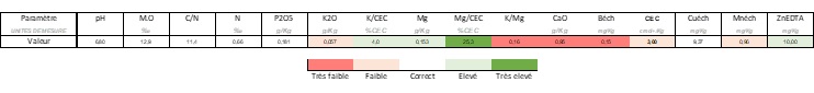 Les caractéristiques granulométriques et analytiques de la parcelle ne sont donc pas limitantes pour l’activité biologique (Indice d’Activité Biologique potentielle de 18,8 – Méthode Biovitis®).