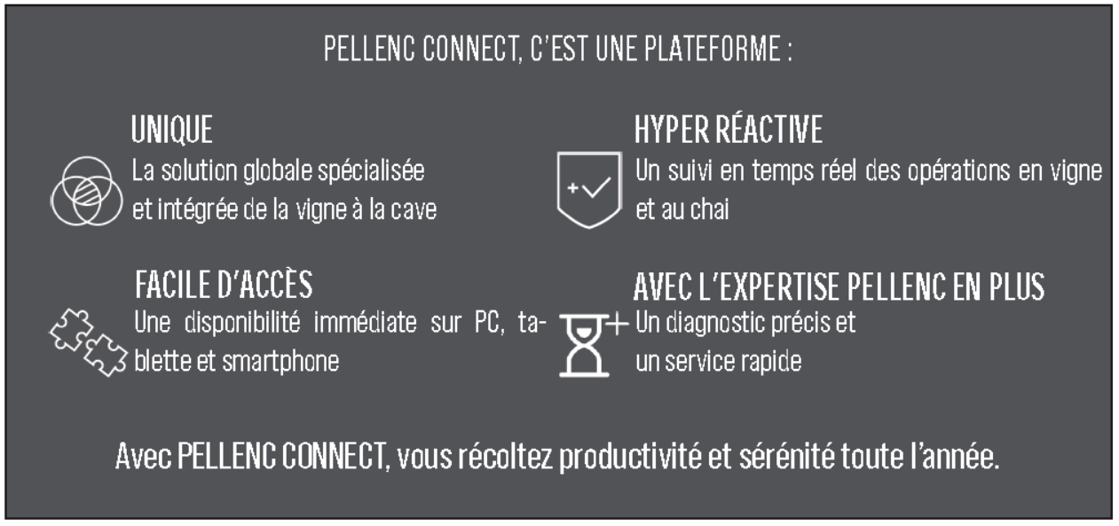 PELLENC CONNECT est une solution globale basée sur la connectivité des équipements utilisés pour remonter de manière sécurisée un ensemble de données. Accessible depuis un PC, une tablette ou un smartphone, cet outil simplifie le suivi et la gestion du matériel, optimise les opérations de production et la conduite des parcelles. Une approche exclusive – de la vigne à la cave – tout au long du cycle de production du vin.