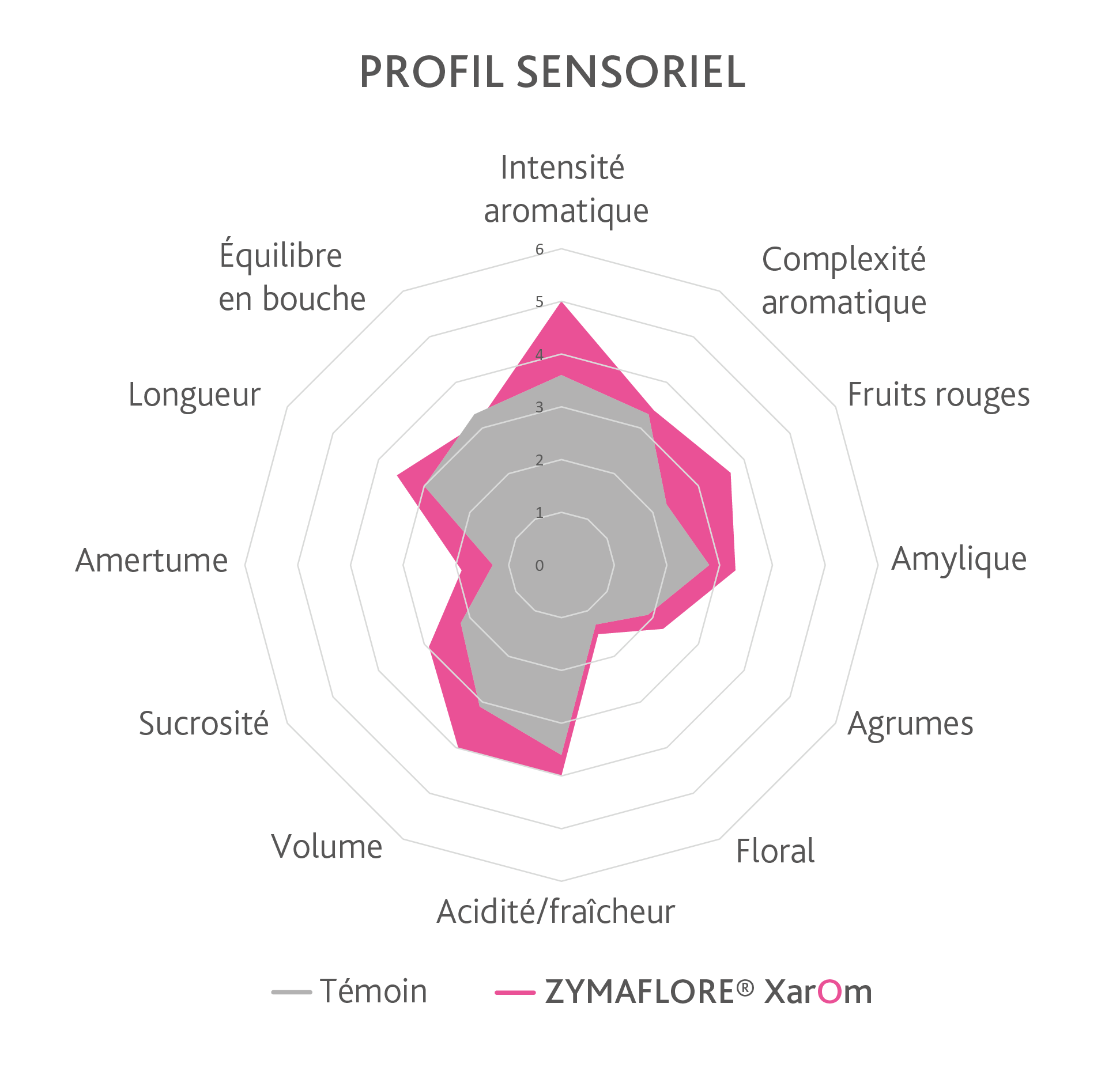 Sélectionnée pour sa forte production d’arômes fermentaires, ZYMAFLORE® XarOm est recommandée pour l’élaboration de vins d'une très grande intensité aromatique. Permet de booster le potentiel des raisins ou de servir de base pour des assemblages. Cette souche possède la capacité génétique de préserver de l’acide malique lors de la fermentation alcoolique. Sa faible production d’acidité volatile ainsi que son caractère POF(-) permettent d’obtenir des vins au profil aromatique net, précis et soutenu.