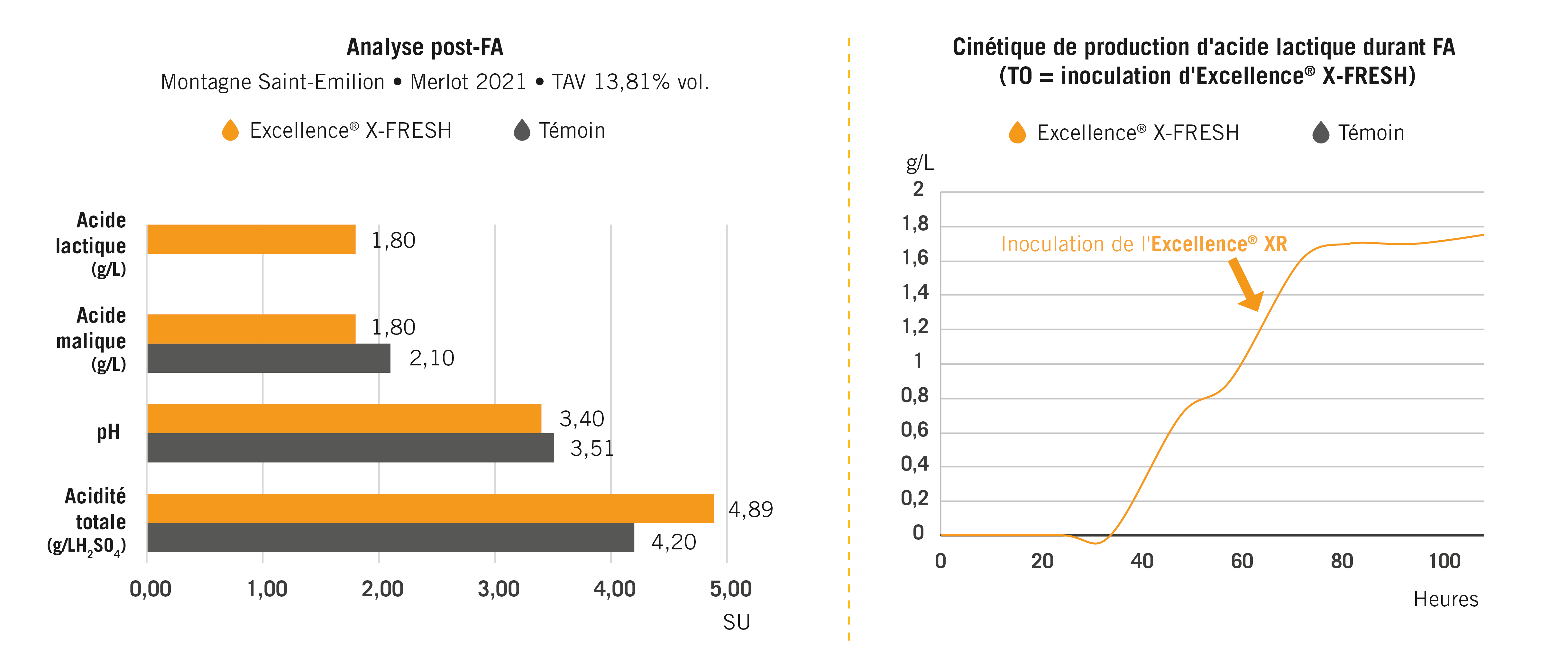Excellence® X-FRESH a été inoculée dès l’encuvage et a produit 1,80 g/L d’acide lactique durant son temps de séquentielle soit entre 48h et 72h. L’inoculation d’Excellence® XR a permis de figer la production d’acide lactique et de réaliser une FA complète.