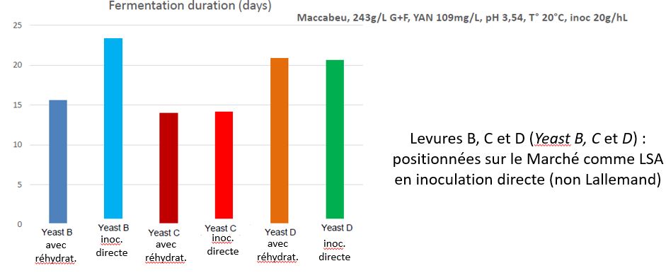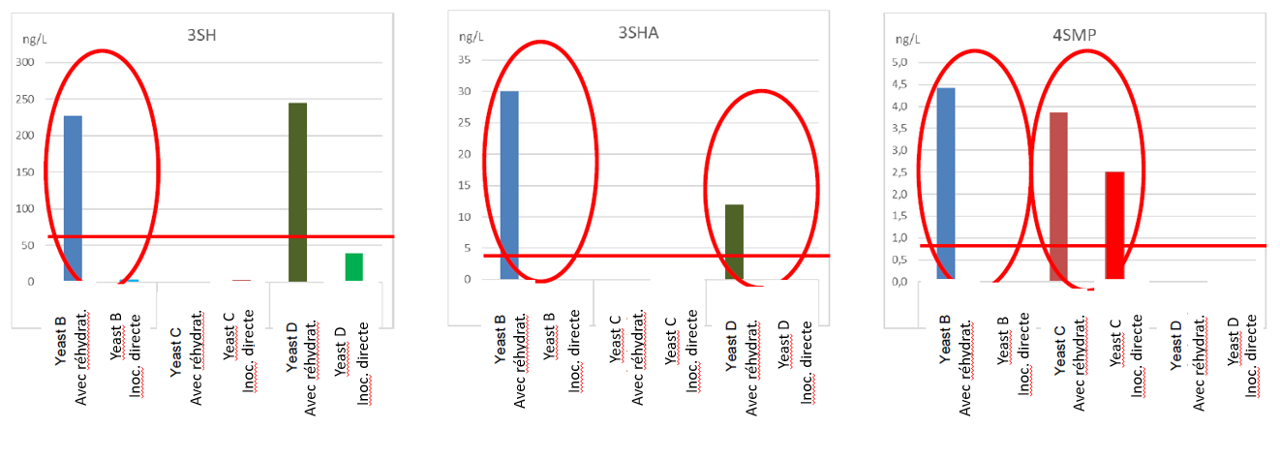 Pour chacune de ces levures, nous avons ainsi comparé leur performance globale (à la fois au niveau sécurité et performance fermentaire et au niveau métabolisme aromatique en lien avec la qualité des vins) selon différents modes de mise en œuvre (avec ou sans réhydratation).