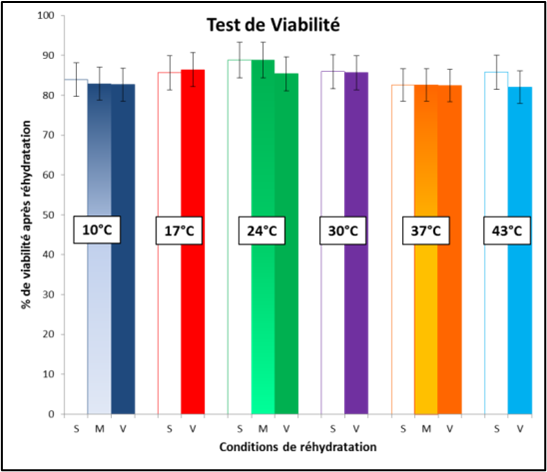 Conditions : La levure SafŒno™ SC 22 a été réhydratée dans une solution d’eau distillée à 10% de saccharose à des températures et dans des conditions d’agitation très différentes pendant 45 minutes.