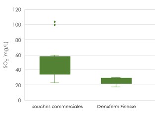 Figure 1: synthèse de 72 essais comparatifs face à 5 souches commerciales différentes avec suivi de la production de SO2 à la fin de chaque fermentation alcoolique (SO2 initial compris entre 30 et 60 mg/L dans le moût avant FA)