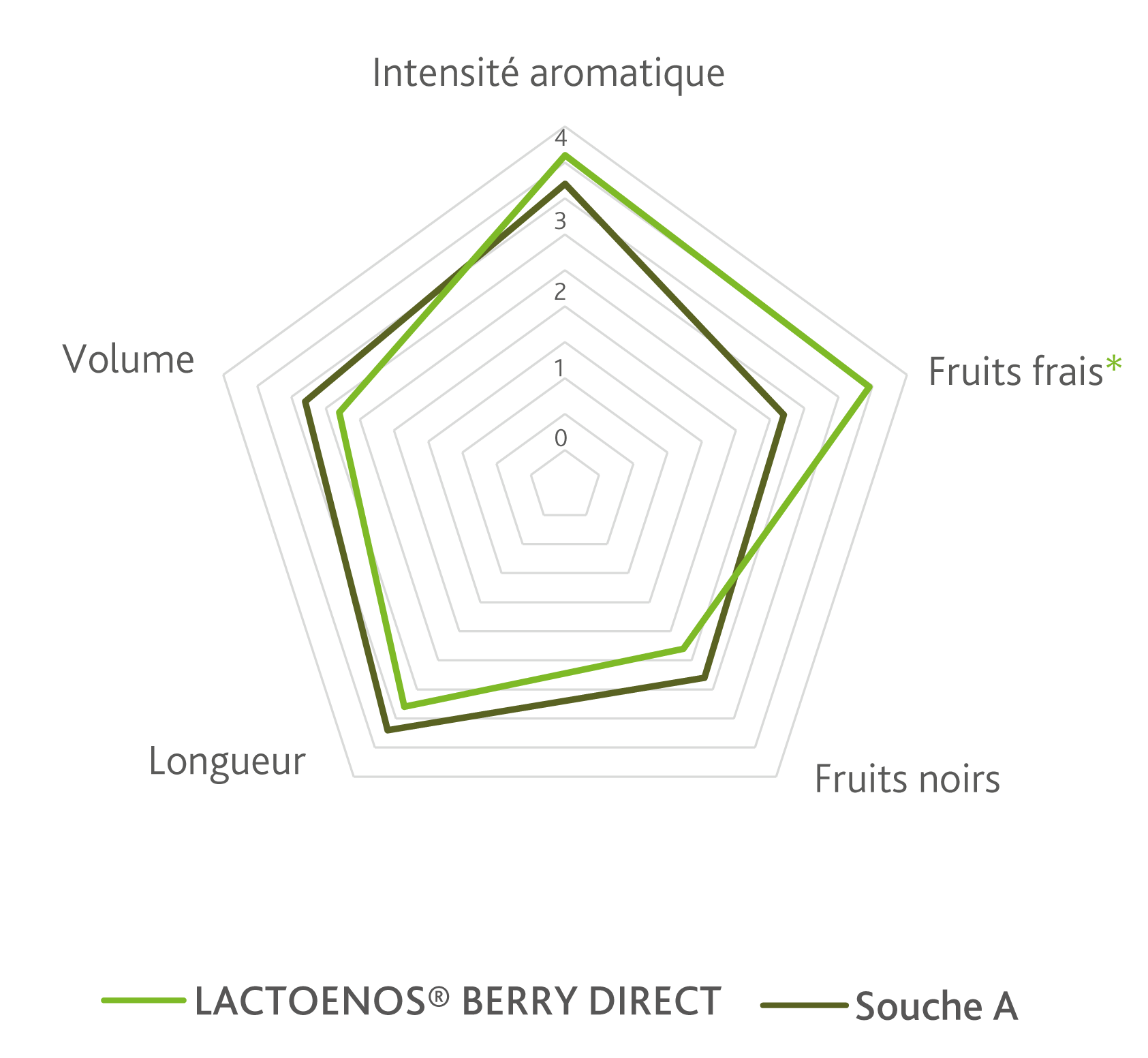 LACTOENOS® BERRY Direct à été sélectionnée pour sa performance fermentaire mais aussi sa capacité à renforcer la fraîcheur des vins et leur intensité fruitée.
