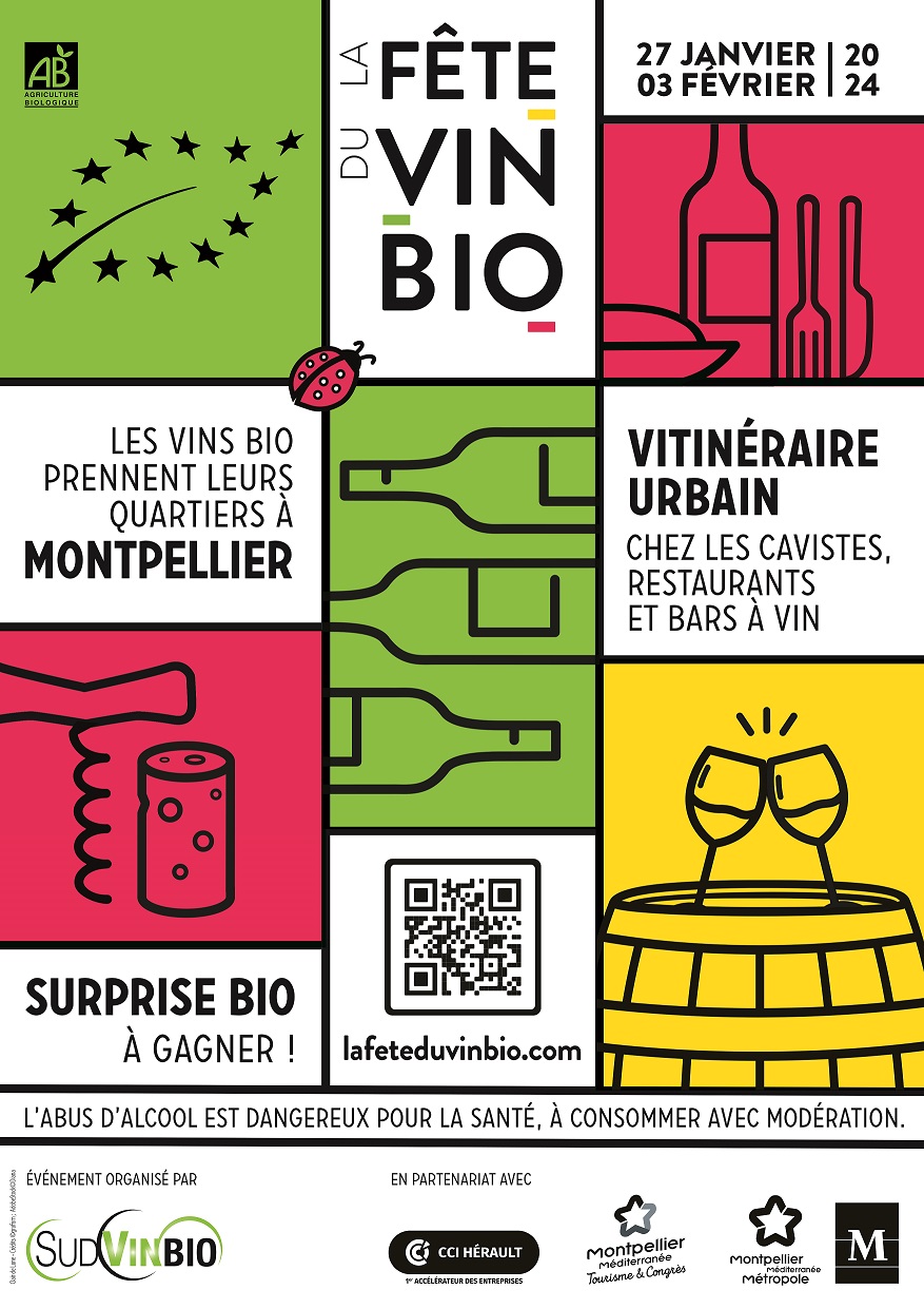La Fête du Vin Bio est une animation commerciale qui se déroulera du 27 janvier au 3 février 2024 à Montpellier. L'objectif est de promouvoir les vins bio ainsi que les établissements locaux qui en proposent. Cet événement permettra également de sensibiliser les consommateurs en les informant sur les modes de production (agriculture biologique, biodynamie, vins sans sulfites ajoutés, végan...), et sur les différents labels répondant aux critères de l'agriculture biologique. Notamment au travers d'une conférence sur le vin bio destinée au grand public :
