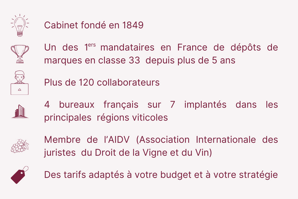 L’un des premiers déposants français de marques en classe 33 (Boissons alcoolisées), Germain Maureau, est implanté dans les principales régions viticoles françaises et apporte grâce à son bureau bordelais, un service de proximité à ses clients (producteurs, négociants, organisations professionnelles...).