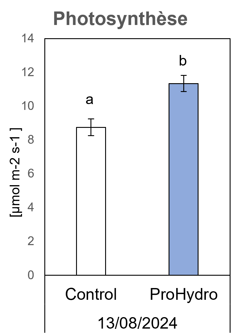 Les mesures de l’activité photosynthétique effectuées pendant une période de vague de chaleur (10 - 17 août, temp. > 35 °C) ont montré que le traitement LalVigneTM PROHYDRO avait permis de maintenir et d’obtenir un meilleur niveau d’activité photosynthétique (figure 1, ci-dessous).
