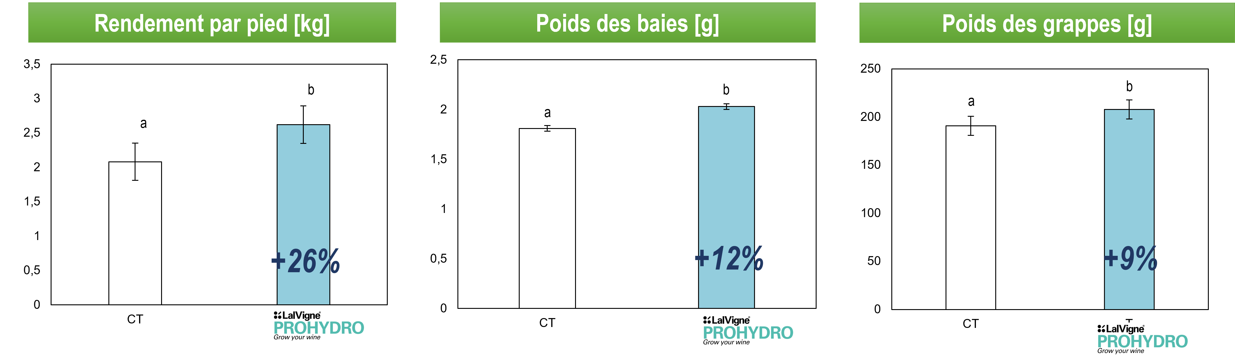 A la vendange, les résultats ont montré des différences de rendements en faveur de la modalité traitée allant de +9 % à +26 % selon l’indicateur (poids des grappes, production par pied ; figure 2 ci-dessous). Lors de la récolte, l’analyse des raisins présente des valeurs de pH plus faibles, et une teneur plus élevée en acide malique pour la modalité LalVigneTM PROHYDRO (analyses non montrées ici).