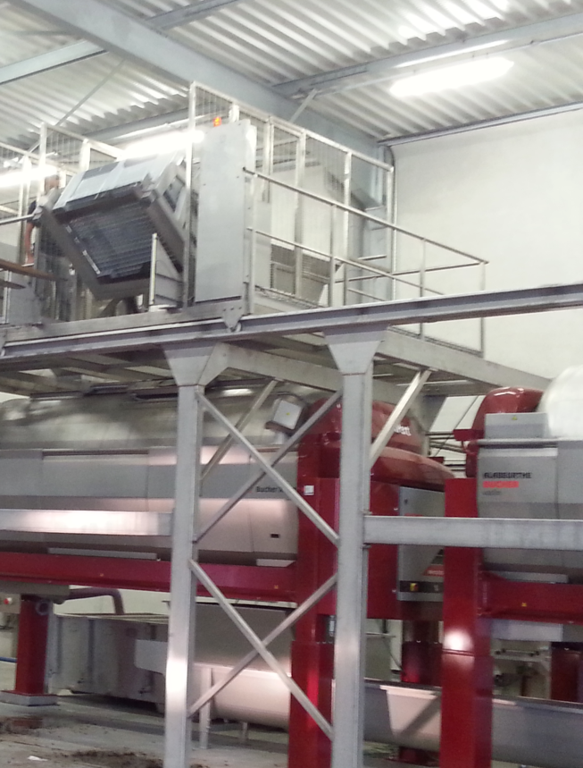 En effet, cet été 2014 a été l’occasion de mettre au point une structure inox avec un chariot de réception des vendanges alimentant les pressoirs Bucher Vaslin.