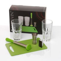 Envie de réaliser le célèbre cocktail ? Tout l'art du bon Mojito est là, dans ce coffret ... Ce coffret cadeau contient l'essentiel pour réaliser un excellent Mojito ! Il comprend : 1 planche à découper, 2 verres à Mojito, 1 doseur à alcool, 1 pilon à cocktail. Il ne manque plus que la glace pilée pour le siroter…