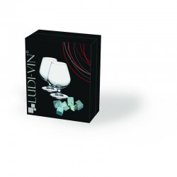 le traditionnel verre COGNAC indémodable, avec 6 glaçons en pierres ollaire suédoise, de marque Taljsten et leur sachet Coldpack.