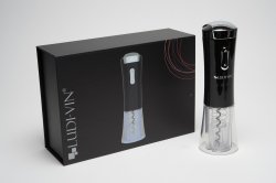 Tire-bouchons électrique rechargeable avec coupe capsule et adaptateur pour prise électrique.
